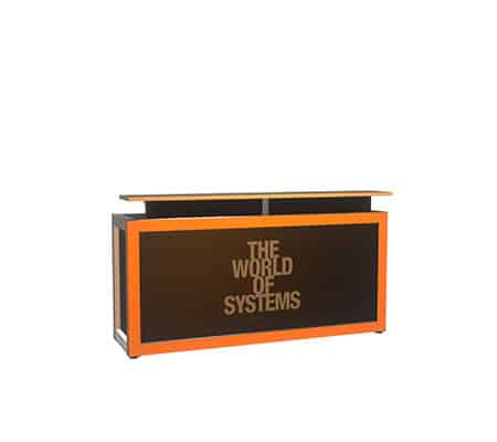 Comptoir avec arêtes lumineuses avec couleur RVB au choix. Comptoir conçu et réalisé avec le système OCTAlux d’Octanorm.