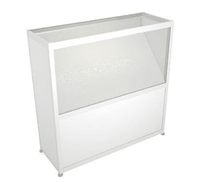 Comptoir-vitrine en structure aluminium et panneaux bois – Eclairage tube led. Présentation de vos produits inclinés pour une meilleure visibilité.