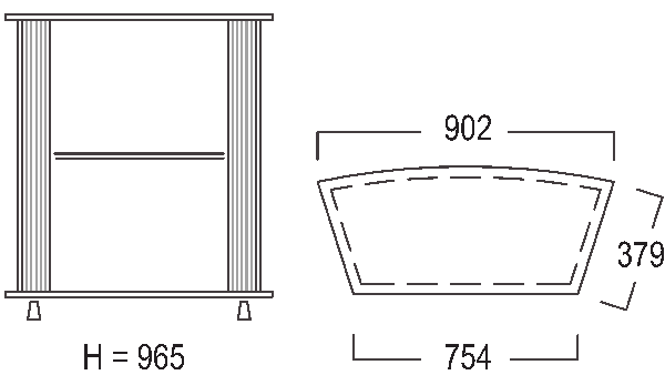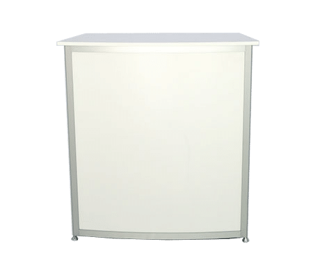 Comptoir d’accueil courbe sur pieds – Etagère intérieure et portes battantes fermant à clef. Possibilité de mettre un visuel imprimé