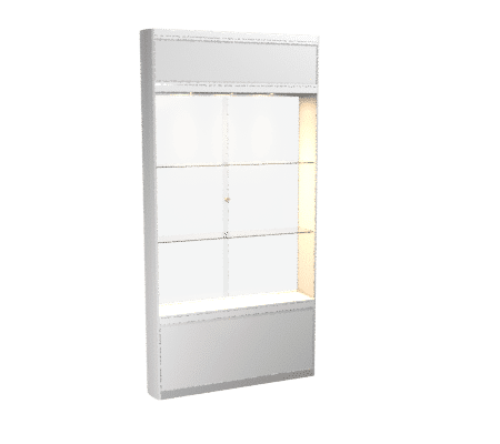 Vitrine avec 3 niveaux d’exposition, joues en aluminium, possibilité de personnalisation par un logo. Plusieurs coloris disponibles.