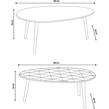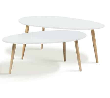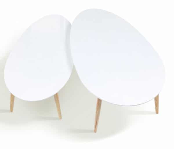 Table « gigogne » au style scandinave. Les pieds sont en bois et le plateau est en médium laqué blanc.