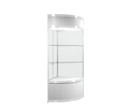 Vitrine cintrée en 1/4 de cercle, rayon 700 mm. Eclairage led sur plafonnier – Portes coulissantes fermant à clef. Plusieurs coloris disponibles.