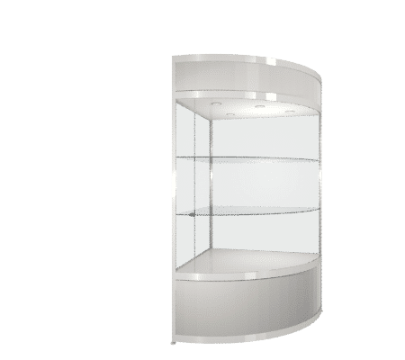 Vitrine cintrée en structure aluminium et panneaux bois – Eclairage led sur plafonnier – Portes coulissantes fermant à clef. Plusieurs coloris sont disponibles.