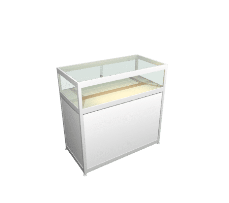 Showcase-counter in aluminum structure and wood panels – LED tube lighting – Sliding doors with key lock. Several colors available.